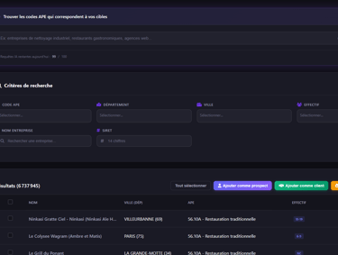Filtrez par activité (code APE), zone géographique (département et ville), par taille d’entreprise (effectif), et par mots clés.