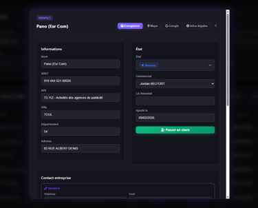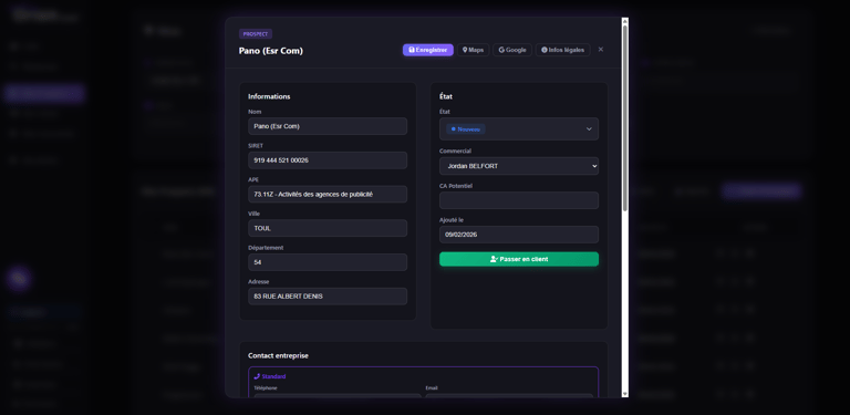 Chaque prospect dispose d’une fiche évolutive regroupant ses informations, ses contacts et son statut.